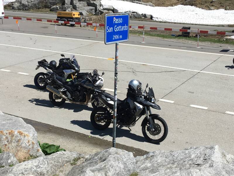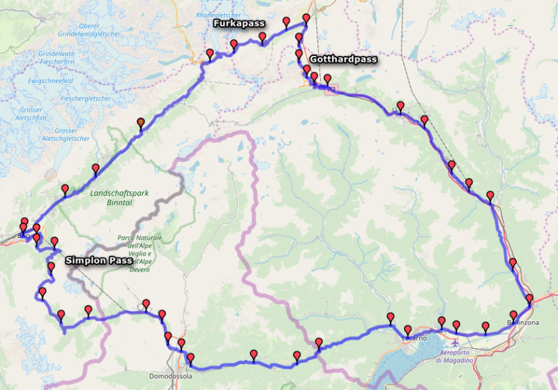Nach einem reichhaltigen Frühstück wurde aufgesattelt, und wieder führte uns der Weg über den Furkapass, auch zum dritten Mal ein Erlebnis wo man sich nicht satt sehen konnte. Mittlerweile war Samstag und man merkte das deutlich mehr Verkehr war als tags zuvor, also schnell weiter zum Gotthardpass und ab in den Süden durch das Valle Leventina Richtung Bellinzona und weiter nach Locarno. Wir machten eine kurze Mittagspause in Tegna und danach starteten wir durch das kurvenreiche Valle Vigezzo/Centovalli Richtung Domodossola und weiter auf den 2005m hohen Simplonpass. Die alte Passstraße blieb uns verwehrt da diese nur für Anlieger frei ist, so mussten wir die unspektakuläre Auffahrt zum Simplon antreten. Ein schnelles "Passbild" und auf der anderen Seite wieder runter, hier fanden wir den Einstieg in die alte Passstraße, die frei fahrbar war, welche viel interessanter zum Fahren ist und man hatte einen tollen Ausblick auf Brig. Von hier ging es wieder zurück zum Hotel wo wir den Tag in der Gartenwirtschaft ausklingen ließen.