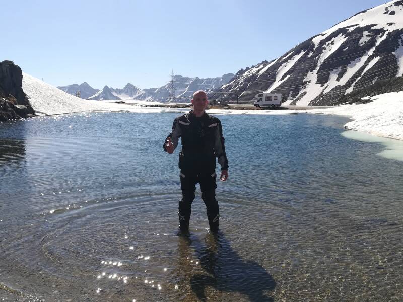 Nach einem tollen Sonnenaufgang über den Schweizer Bergen war es heute Zeit für die "hohe Acht", wir starteten schon früh um 9.00Uhr und es ging auf kurvenreicher Strecke den Nufenenpass hinauf und weiter nach Airolo. Von hier rollten wir wieder aufwärts über die Tremola, die alte Kopfsteinpflaster Passstraße, auf den 2106m hohen Gotthardpass. Die Zeit drängte und wir starteten durch zum Furkapass auf 2436m wo sich ein grandiose Aussicht bot. Nach einer kleinen Stärkung im Töff-Treff in Gletsch fuhren wir wieder, wie tags zuvor, auf den Grimselpass aber diesmal von der anderen Seite. hier hatte man ein tolles Fotomotiv, den Totensee, mit Eisschollen wie im Polarmeer. Nach dem die Kameras verstaut waren ging es weiter über den Sustenpass, vorbei an meterhohen Schneewänden die auch wieder als Fotokulisse dienten, zum Gotthardpass, diesmal von der anderen Seite. Hier bogen wir dann noch zu einem Abstecher zum Oberalppass ab. Hier entspringt der Rhein wwas durch den Leuchtturm dargestellt wird und sogleich auf einem Foto festgehalten wurde. Der Weg zurück zum Hotel in Gluringen führte uns zum Abschluss des Tages abermals über den Furkapass.